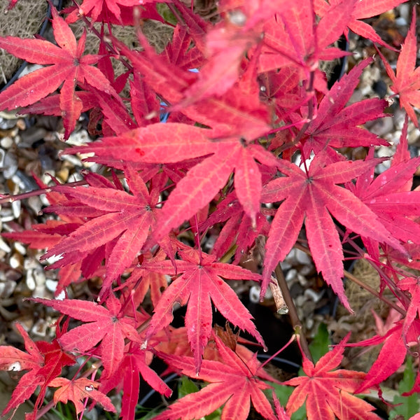 ‘Hama Otome’ is a compact, slow-growing Japanese Maple celebrated for its dense, rounded form and soft, delicate leaves. The foliage emerges a rich red in spring, gradually maturing to deep green through summer before transforming into brilliant scarlet and orange tones in autumn. Its refined size and elegant shape make it an ideal feature for small gardens, courtyards, or container displays.